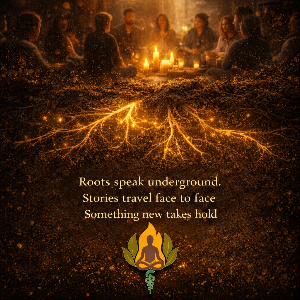 Roots speak underground. Stories travel face to face. Something new takes hold.